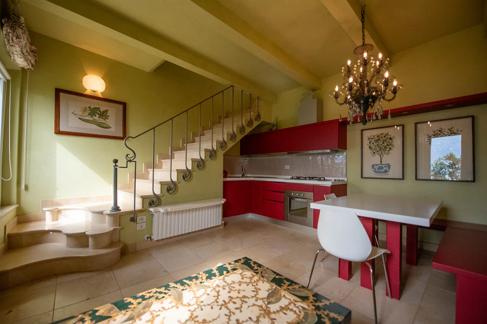 Appartamento con una camera matrimoniale, un divano letto nel soggiorno e un letto aggiuntivo disponibile al piano superiore. Ricavata dalle antiche scuderie dello storico edificio, Oriente prende il nome dai colori caldi dei mobili, dai disegni dei tessuti e delle imbottiture. Ha un ingresso indipendente dal giardino principale a forma di terrazza con vista su scorci della costa adriatica. Al piano terra il soggiorno con cucina, la sala da pranzo e un piccolo salottino con divano letto. Al primo piano un primo bagno, la camera matrimoniale con vista mare ed un secondo bagno. Sopra un piccolo studio dove è possibile aggiungere facilmente un secondo letto. Incantevole armadio con ante che riproducono decori del XVII secolo e la testiera in legno dipinta da un famoso artista messicano.